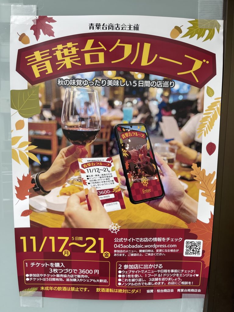 今年の青葉台クルーズは11/17(月)から11/21(金)での開催!最新の開催日程や参加店のリスト、チケット情報は、ウェブサイトや公式SNSでチェックしてください。