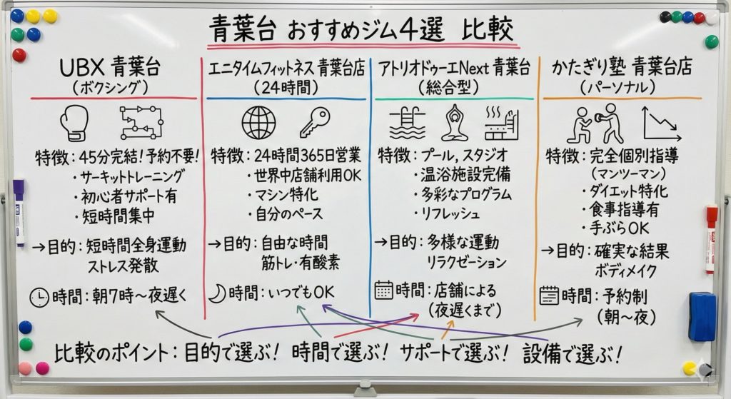 多岐にわたるジムの中から、特に特徴的で多くの方におすすめできる4つのジムをピックアップし、その特徴を整理しました。